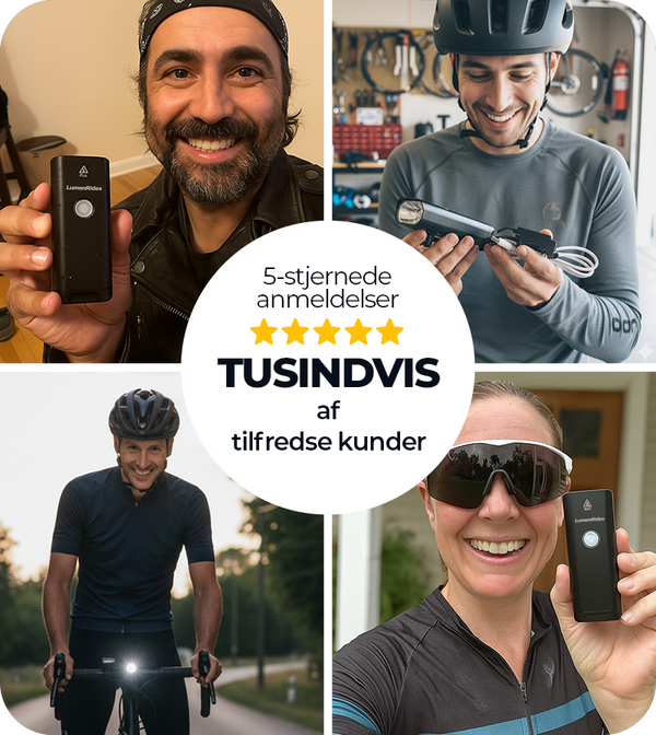 Inde i æsken finder du LumenRides Max Drive forlygte til cyklen, et holdbart styrbeslag med justerbar rem og en brugervejledning, så du kan komme i gang med det samme. Lygten har en integreret USB-C-opladningsport, så du nemt kan oplade den og tage afsted på få minutter.